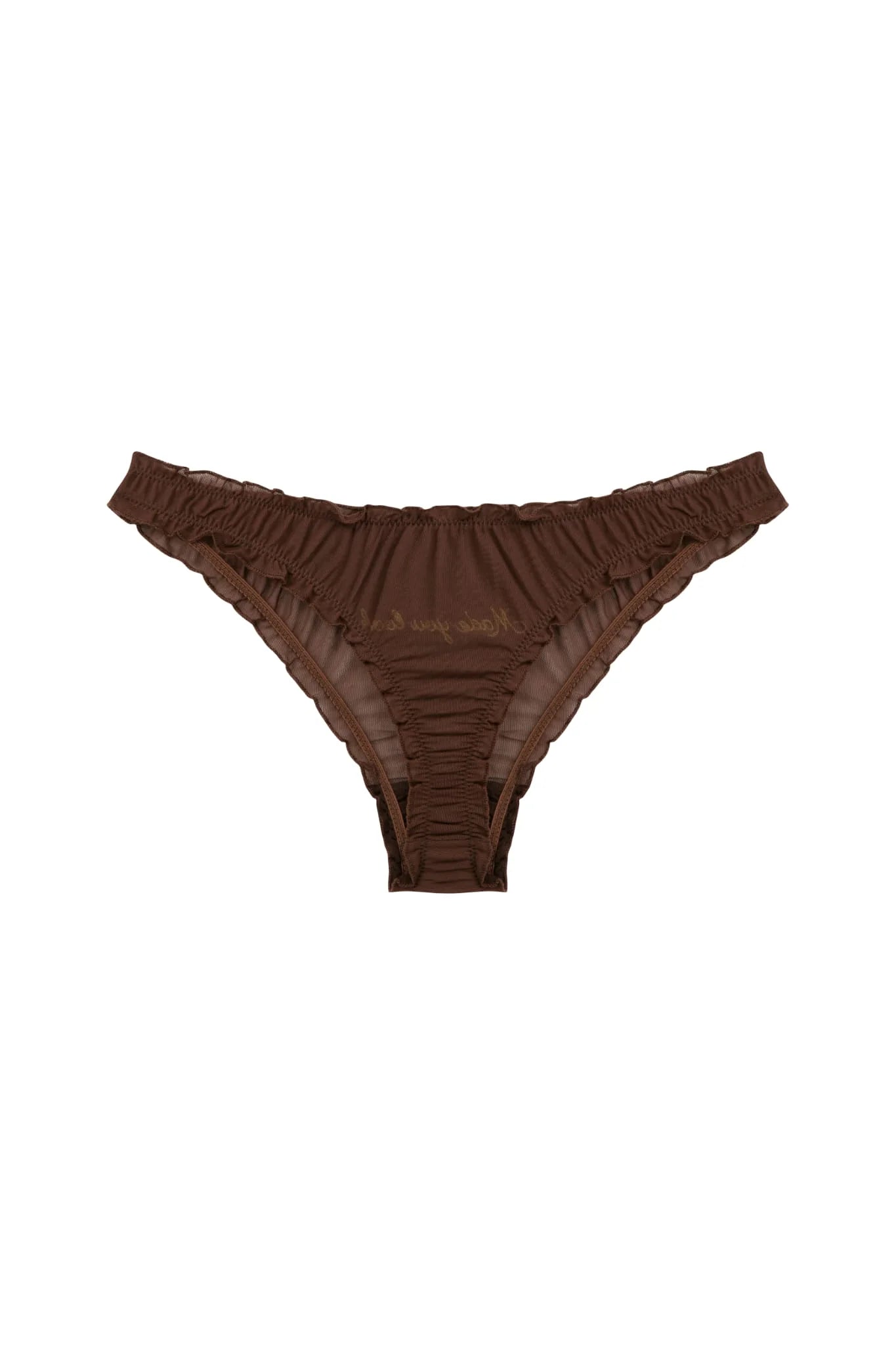 Introducing the "Made You Look String" – a delicate addition to our collection that combines softness with a bold statement. This exquisite piece comes in a gentle brown, symbolizing the tender yet powerful essence of femininity. Adorned with yellow embroidered "Made You Look" it speaks to the intuitive and sensual aspects of one's being. With its playful frills and the enticing transparency of tulle, it's designed to evoke a sense of allure and confidence. Perfect for those who embrace their sensuality with grace and strength, the "Made You Look String" is a celebration of intimate knowledge and self-expression, making it an essential piece for a nuanced and deeply personal wardrobe.