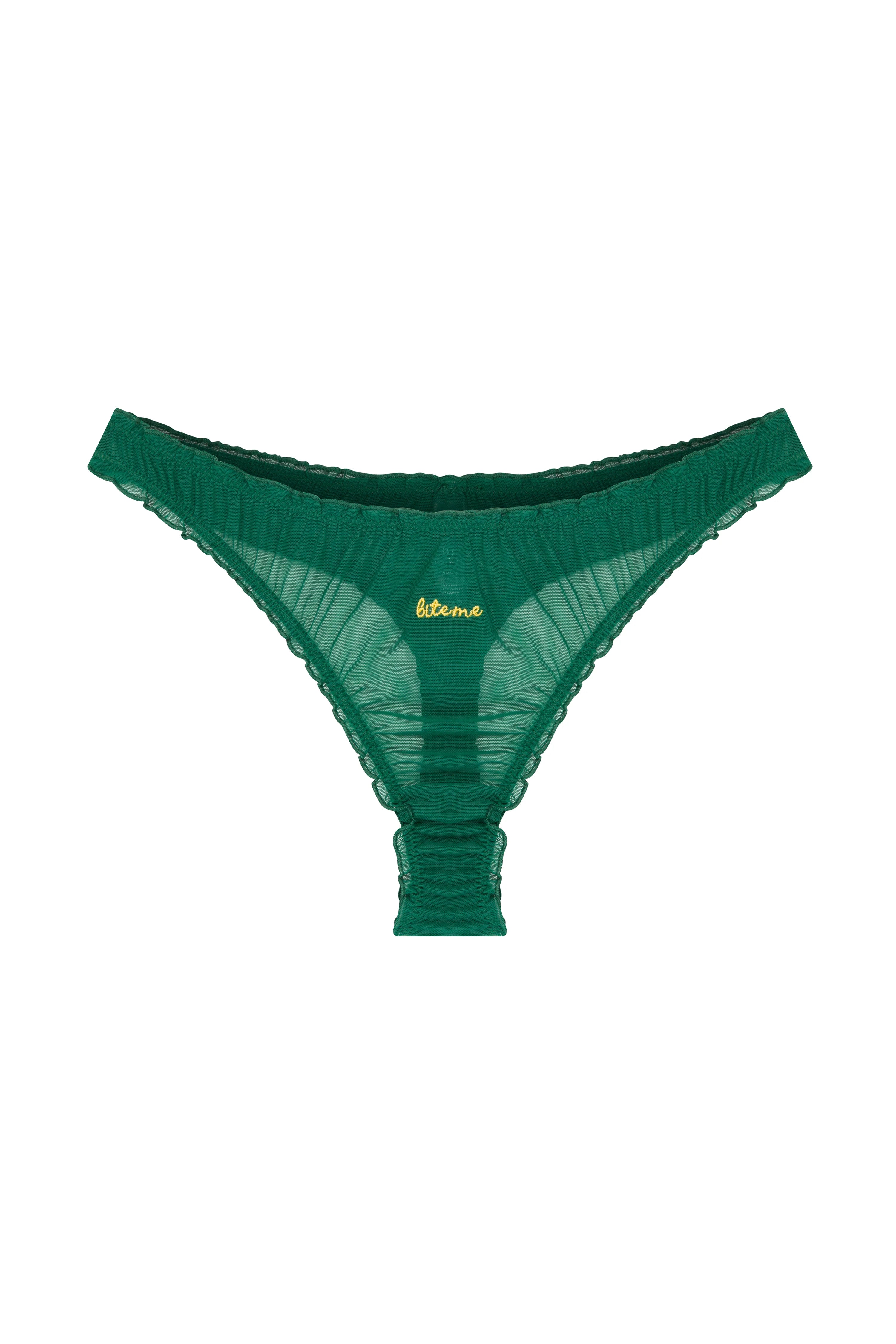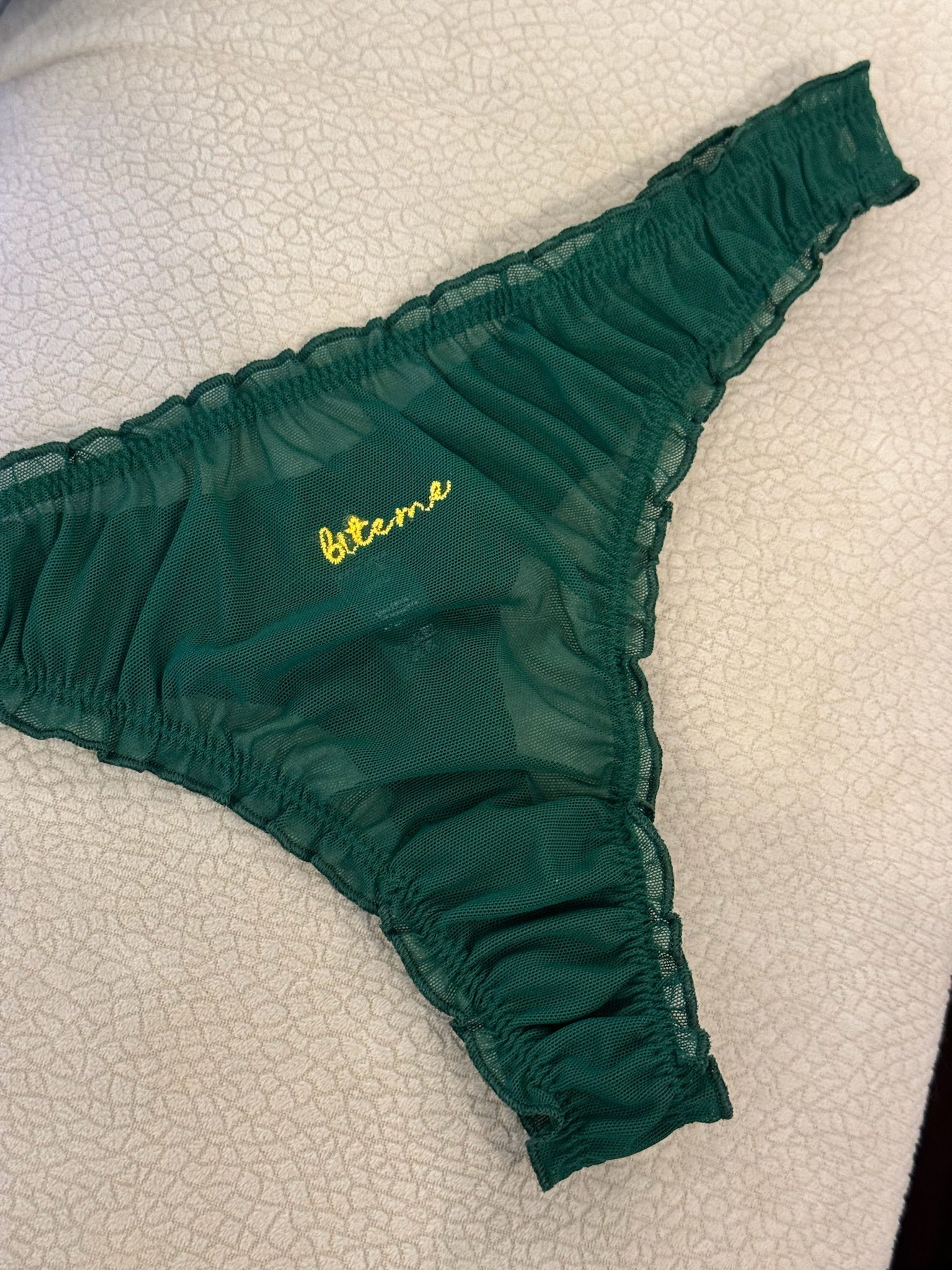Introducing the "Bite Me String," where playful elegance meets seductive charm. This exquisite piece comes in two captivating color options: a vibrant nectarine and a rich green, each designed to make a bold statement. Adorned with golden embroidered "Bite me" on the front, it symbolizes love's luxurious touch. The playful frills add a whimsical twist, while the delicate tulle construction ensures a sexy and sophisticated feel. Perfect for those seeking to add a dash of romance and a hint of playfulness to their intimate wardrobe, the "Biterme String" is a testament to the beauty of combining comfort with couture.