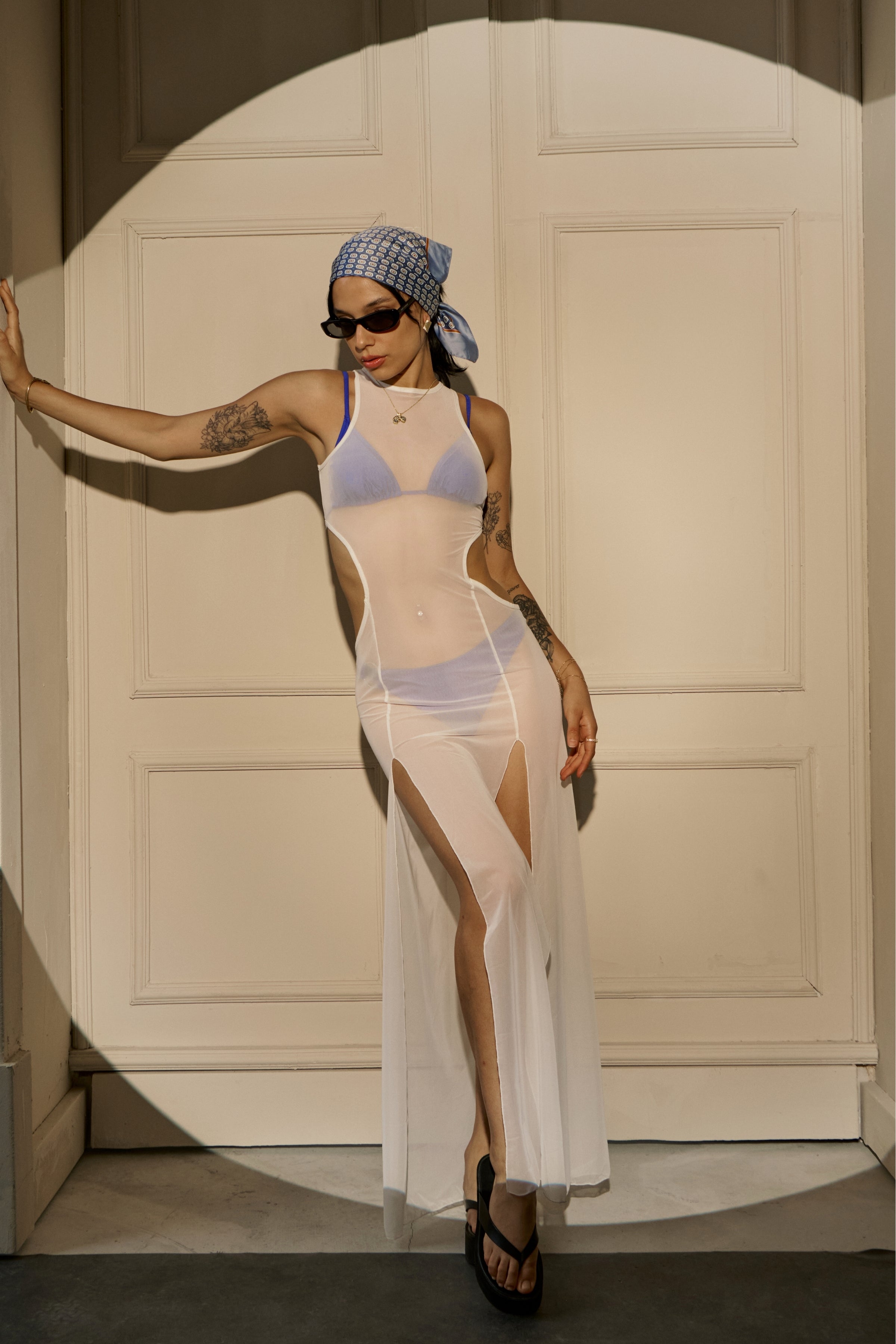 Derin sırt dekolteli, çift yırtmaçlı Rhea Pareo Elbise terletmez ve kaşındırmaz tülden üretilen, yumuşacık akan bir kumaşa sahiptir.